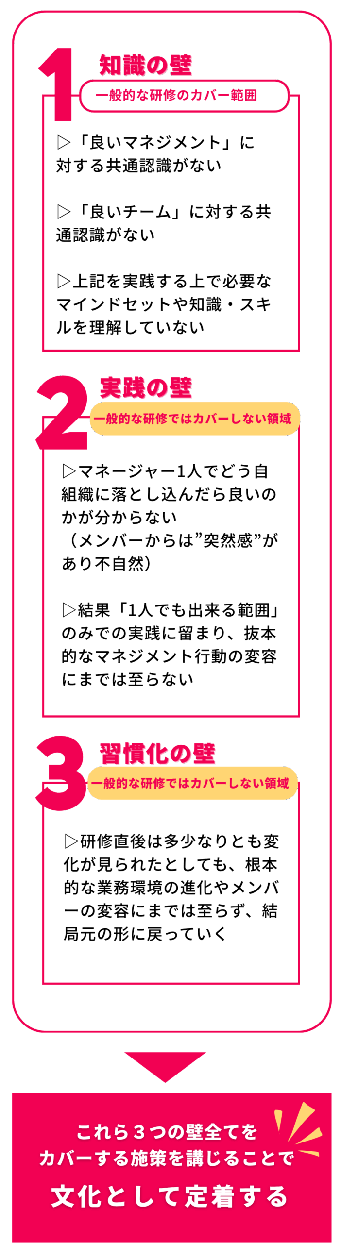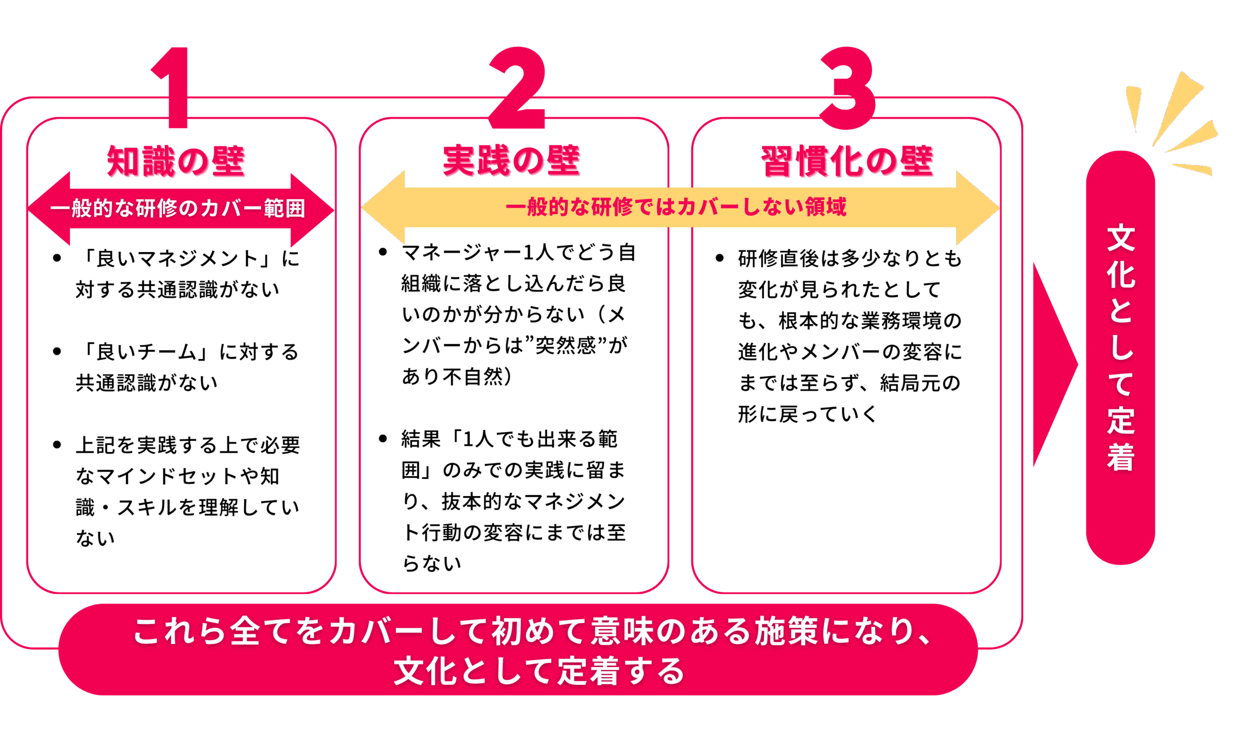 当プログラムでは、知識の壁(一般的な研修のカバー範囲)に加え、実践の壁・習慣化の壁の3つの壁全てをカバーします。