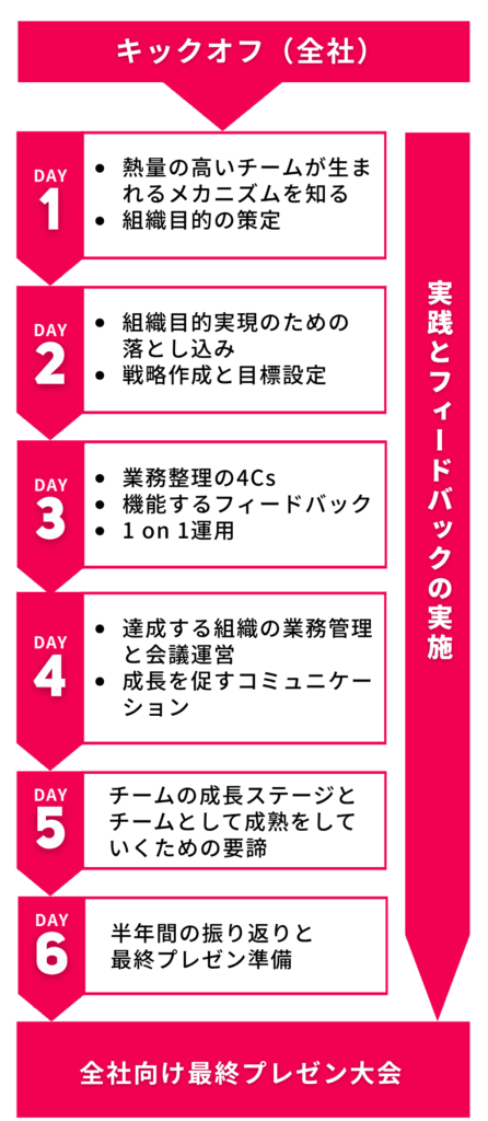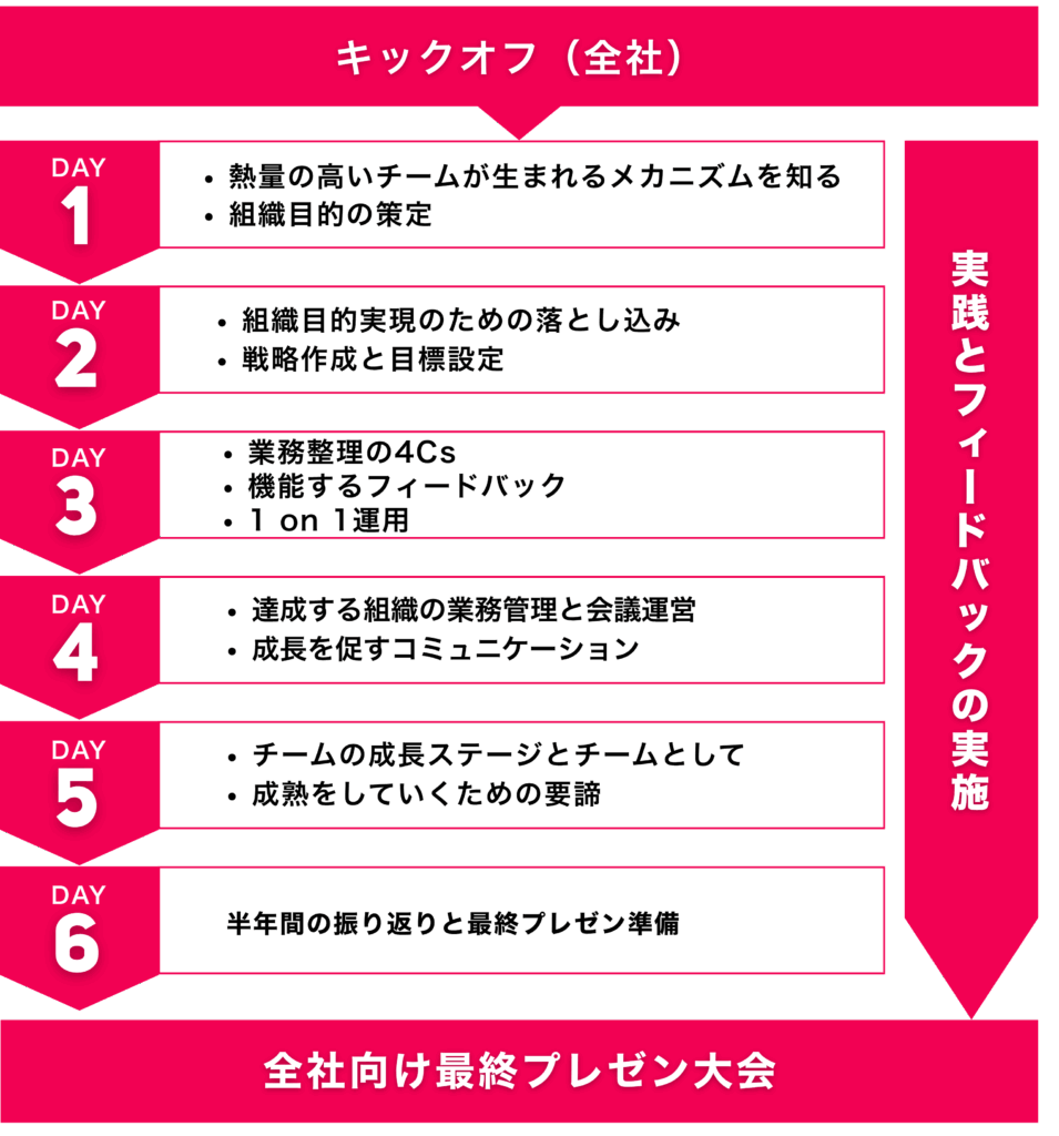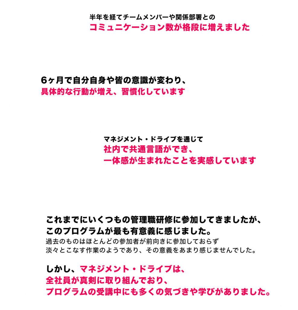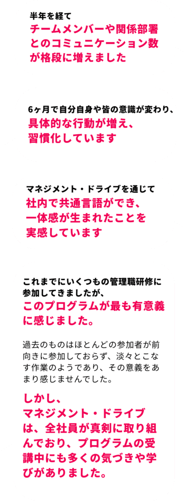 マネジメント・ドライブ®は組織の共通言語づくりと実践を通じて文化として定着させることに徹底的にこだわって設計された、半年間のマネジメント・ブートキャンププログラムです。